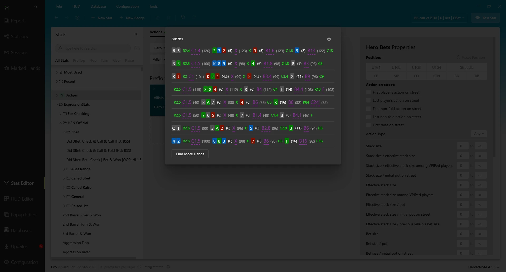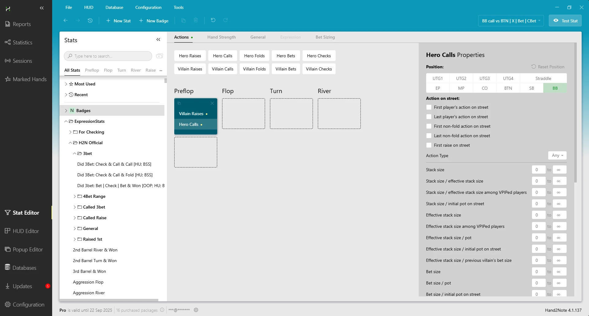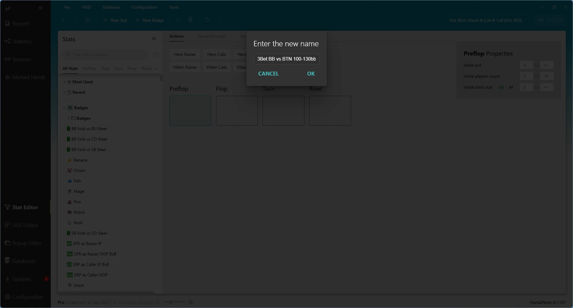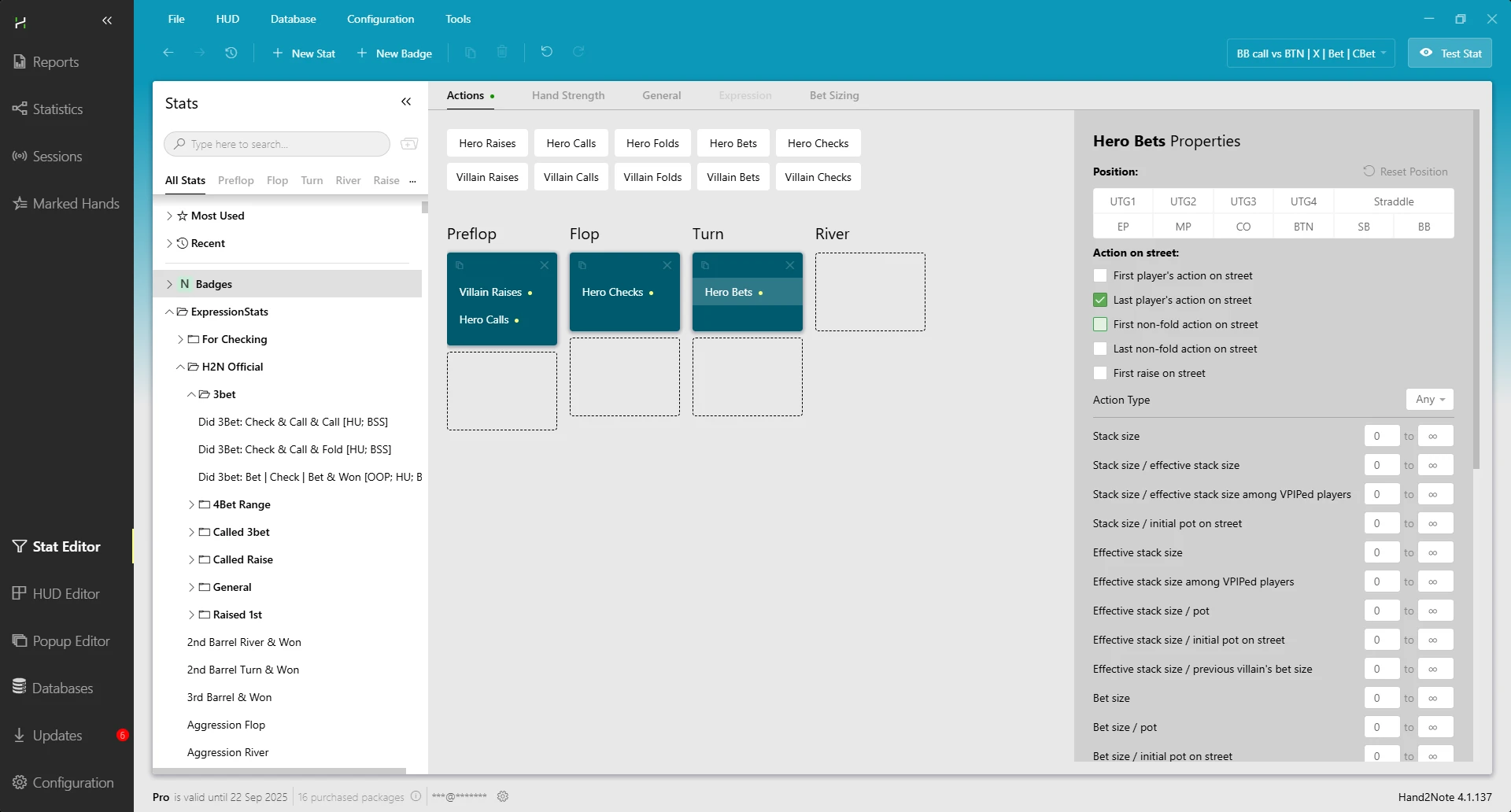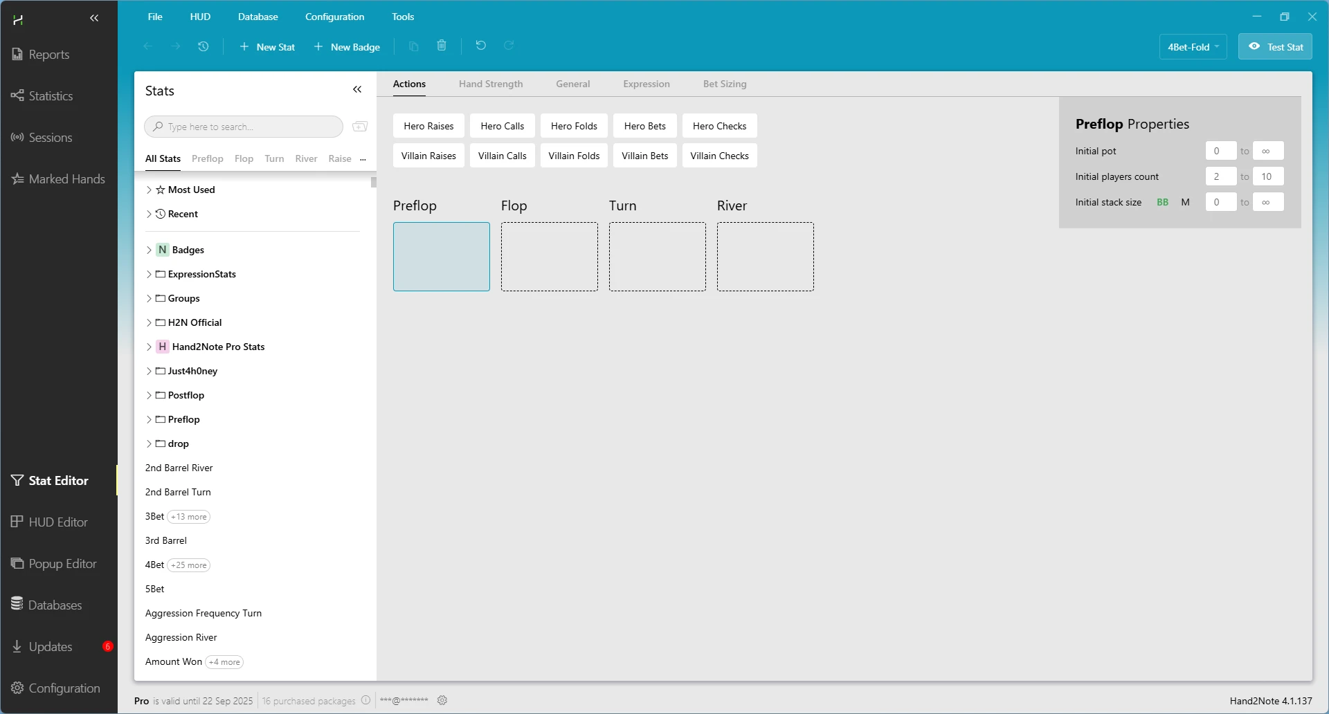 19 Aug 2025 Intermediate This material is for medium-skilled players HUD MDA stats Hand2Note is a powerful tool for analyzing poker hands, offering the ability to create and customize your own stats for a deeper understanding of the game. In this lesson, we will examine the process of creating simple and advanced stats in Hand2Note 4, as well as their integration into HUDs and pop‑ups, with detailed examples and illustrations. Introduction to Hand2Note Stats In Hand2Note, stats are divided into two main categories: Simple stats - show the frequency of a specific action in a particular game situation, such as Open Raise or Continuation Bet. Advanced stats - calculated by specific formulas using simple stats as arguments, for example, Aggression Factor or WTSD. Example of a simple stat: Open Raise - shows how often a player makes the first raise preflop. Example of an advanced stat: Aggression Factor is calculated by the formula: (Cases(Flop Bet or Raise) + Cases(Turn Bet or Raise) + Cases(River Bet or Raise)) / (Cases(Flop Call) + Cases(Turn Call) + Cases(River Call)) ⚠️ In the stats editor, "Hero" always refers to the player for whom the stat is being gathered. For example, if you want to see how an opponent opens from EP, in the stats editor under Hero specify position EP. "Villain" usually refers to all the players remaining in the hand. To narrow a particular statistic, specify the Villain's position or a custom ID you assigned preflop. Overview of Stats Editor Tabs Actions Tab The Actions tab lets you define the sequence of moves for Hero and Villain on selected streets. In the central window, click action buttons (Bet, Raise, Call, Check, Fold) for Hero and Villain. Use the selector to choose which street (Preflop, Flop, Turn, River) these conditions apply to. When you select a street or specific action, a properties panel appears on the right: Initial pot - the size of the pot at the moment of action Initial players count - number of players in the hand on that street Initial stack size - stack sizes of the players For each action, you can also set additional parameters such as preflop position, stack range, pot percentage, and more. Hand Strength Tab On the Hand Strength tab, you can filter by Hero's hand strength and board texture: In the Hand Value section, choose pocket‑hand categories (pairs, draws, "Air," etc.). In the Board section, describe the required board structure (presence of flush/straight draws, specific card ranks, etc.). All conditions show up in the central field, where you can combine them with logical operators And, Or, Not; you can break a group by selecting it and clicking Ungroup. General Tab In General, set the basic hand parameters: Game format (cash or tournament) and poker discipline (Hold'em, Omaha, etc.) Blind and ante sizes Hero and Villain positions Additional options: Players in hand, Fish on blinds Stardle, etc.. Creating Simple Stats Preflop Step 1: Open the Stats Editor Go to Stats Editor. Click Create New Stat and enter a name, for example: 3Bet BB vs BTN 100‑130bb This stat will show how often opponents on the BB 3‑bet a preflop open from BTN in heads‑up with effective stacks of 100-130 BB. Step 2: Configure Action Conditions In the Actions section add these conditions: Villain: Raise from BTN, first non‑fold action Hero: Raise from BB, effective stack 100-130 BB First player's action on street - only count situations where the specified action was the first action the player took that street. Last player's action on street - only count situations where the specified action was the last action the player took that street. First non‑fold action on street - no other actions (aside from folds) occurred before the specified action that street. Last non‑fold action on street - no other actions (aside from folds) occurred after the specified action that street. First raise on street - mostly used preflop to exclude isolations. Step 3: Test the Stat Click Test at the top of the editor. Review the hands matching the conditions to ensure the stat is correct. Postflop Step 1: Open the Stats Editor (if you closed it by accident) Go to Stats Editor. Click Create New Stat and enter: BB call vs BTN | X | Bet | CBet This stat will show how often opponents on BB call preflop and then fire two barrels against a missed flop C‑bet from BTN. Step 2: Configure Action Conditions In Actions add: Preflop: Villain: Raise from BTN (first non‑fold); Hero: Call from BB. Flop: Hero: Check (last action). Turn: Hero: Bet (last action). River: Hero: Bet. Step 3: Test the Stat Click Test and verify the resulting hands. Creating Advanced Stats Step 1: Open the Stats Editor Go to Stats Editor. Click Create New Stat and enter a name, e.g. Aggression Factor. Then switch to the Expressions tab. Step 2: Enter the Formula Use simple stats as arguments in formula: (Cases(Flop Bet or Raise) + Cases(Turn Bet or Raise) + Cases(River Bet or Raise)) / (Cases(Flop Call) + Cases(Turn Call) + Cases(River Call)) Available formula functions: Value - returns the percentage value of the chosen stat. Cases - shows the number of hands where the player's actions met the specified condition. Opps - indicates how many hands the player had the opportunity to perform the action. VsHeroCases - counts how many hands the player acted against Hero and met the filter. VsHeroOpps - shows how many hands the player faced Hero and had the chance to meet the filter. WonHandCases - returns the number of hands where the player's action met the filter and won the pot. WentToSDCases - records how many hands met the filter and went to showdown. WonHandAtSDCases - shows how many hands met the filter, went to showdown, and won the hand. AmountWon - sums the player's winnings in big blinds for all hands meeting the filter. Adding a Stat to HUD or Pop‑up Step 1: Open the HUD or Pop‑up Editor Select an existing profile or create a new one. Step 2: Add the Stat Option 1: Select a cell → Right