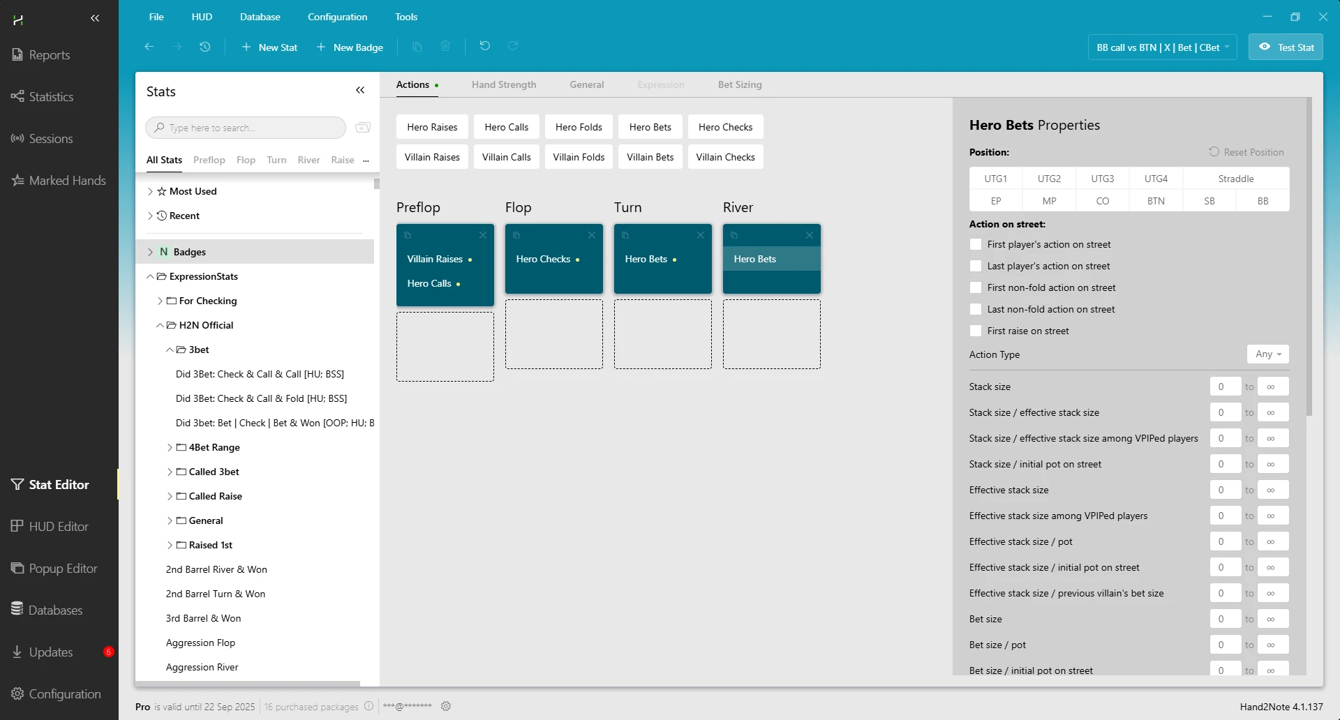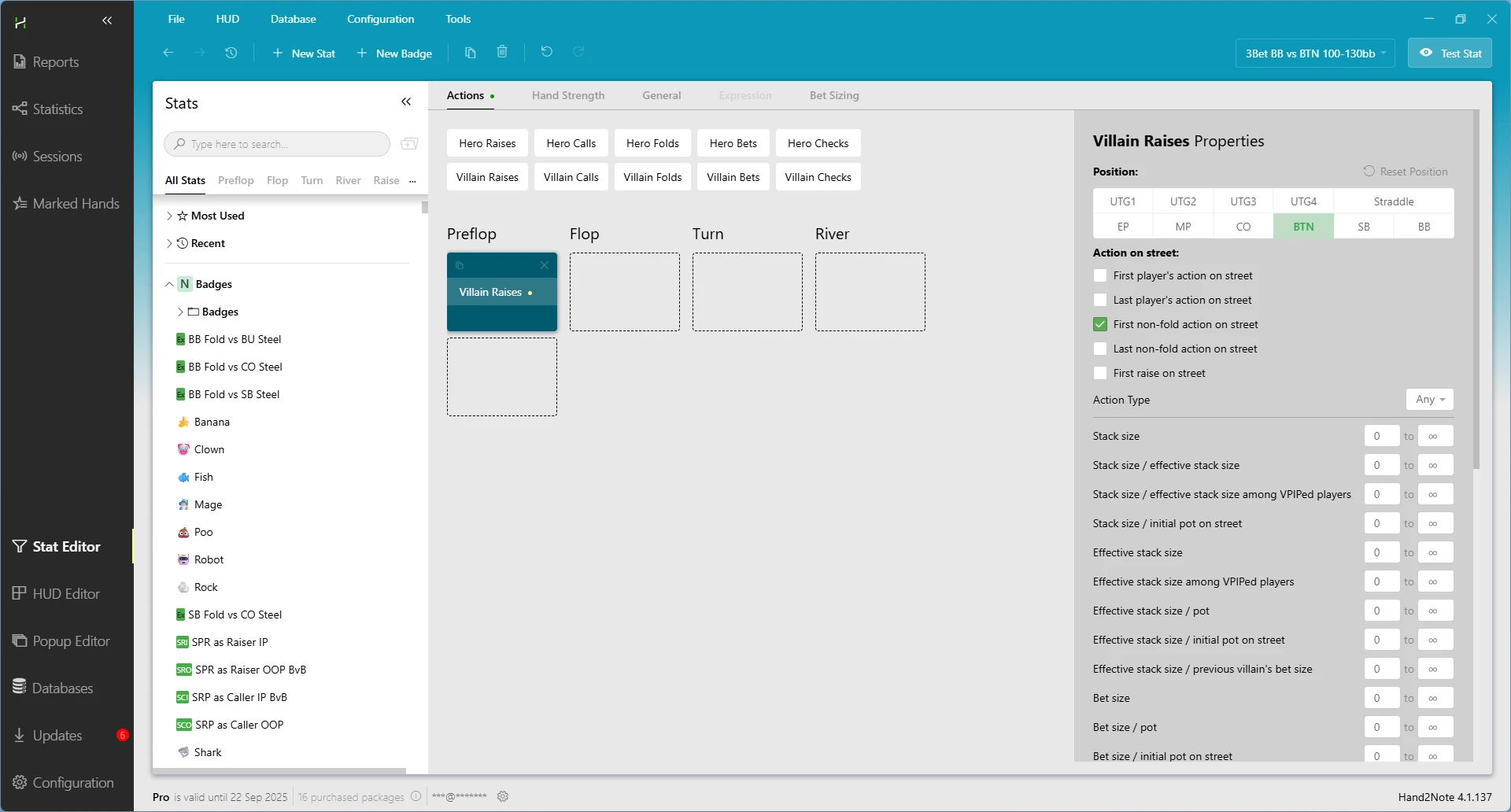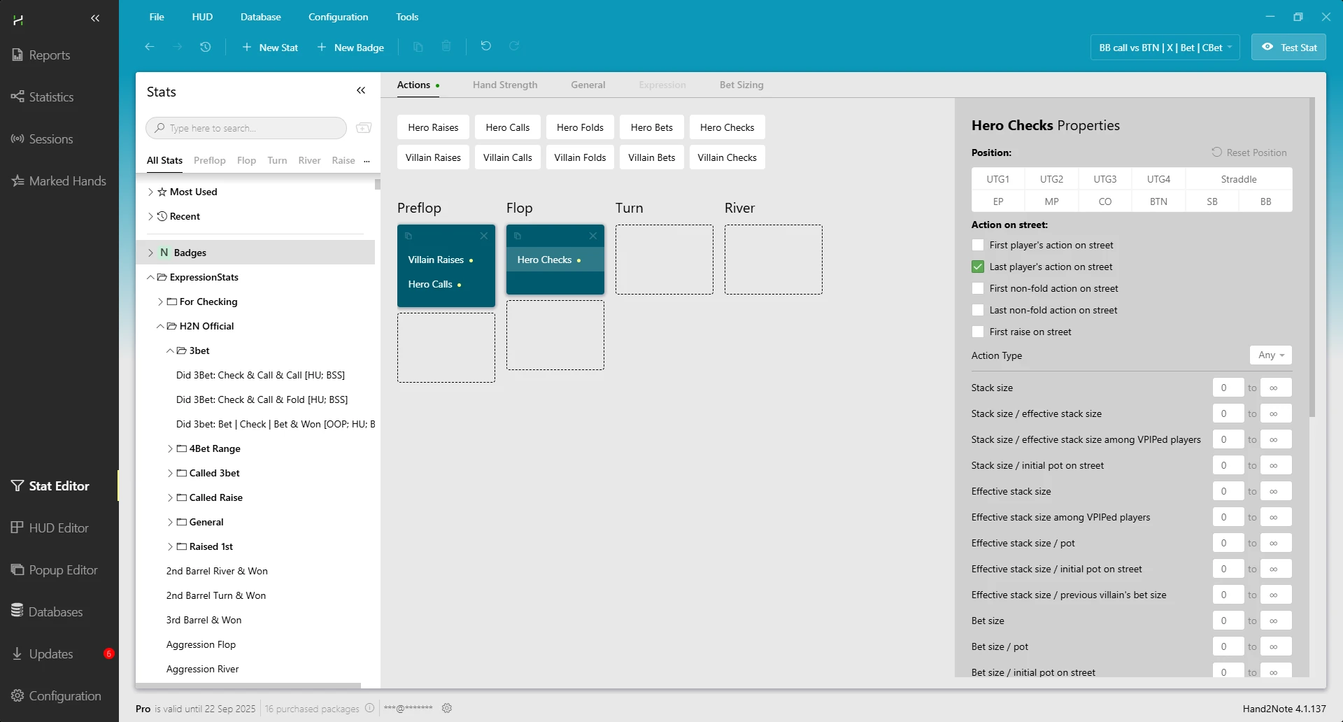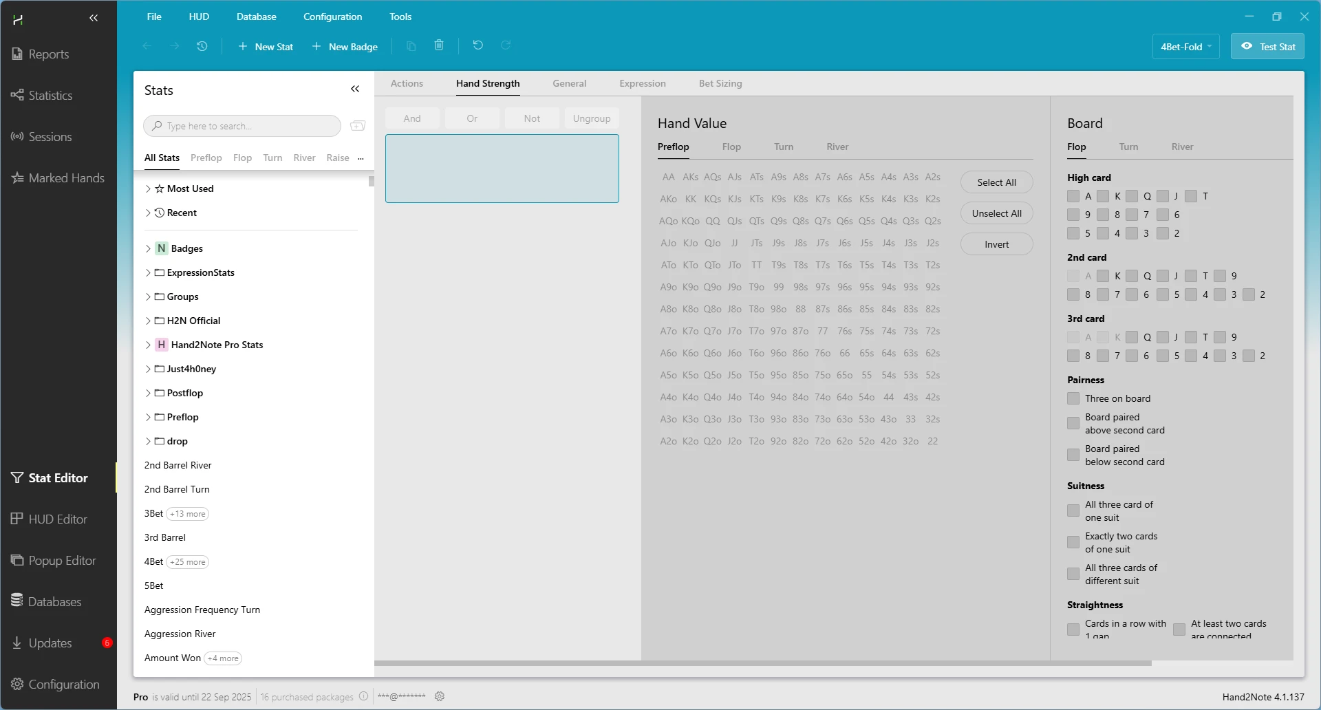 19 Aug 2025 Intermediate This material is for medium-skilled players HUD MDA stats Hand2Note is a powerful tool for analyzing poker hands, offering the ability to create and customize your own stats for a deeper understanding of the game. In this lesson, we will examine the process of creating simple and advanced stats in Hand2Note 4, as well as their integration into HUDs and pop‑ups, with detailed examples and illustrations. Introduction to Hand2Note Stats In Hand2Note, stats are divided into two main categories: Simple stats - show the frequency of a specific action in a particular game situation, such as Open Raise or Continuation Bet. Advanced stats - calculated by specific formulas using simple stats as arguments, for example, Aggression Factor or WTSD. Example of a simple stat: Open Raise - shows how often a player makes the first raise preflop. Example of an advanced stat: Aggression Factor is calculated by the formula: (Cases(Flop Bet or Raise) + Cases(Turn Bet or Raise) + Cases(River Bet or Raise)) / (Cases(Flop Call) + Cases(Turn Call) + Cases(River Call)) ⚠️ In the stats editor, "Hero" always refers to the player for whom the stat is being gathered. For example, if you want to see how an opponent opens from EP, in the stats editor under Hero specify position EP. "Villain" usually refers to all the players remaining in the hand. To narrow a particular statistic, specify the Villain's position or a custom ID you assigned preflop. Overview of Stats Editor Tabs Actions Tab The Actions tab lets you define the sequence of moves for Hero and Villain on selected streets. In the central window, click action buttons (Bet, Raise, Call, Check, Fold) for Hero and Villain. Use the selector to choose which street (Preflop, Flop, Turn, River) these conditions apply to. When you select a street or specific action, a properties panel appears on the right: Initial pot - the size of the pot at the moment of action Initial players count - number of players in the hand on that street Initial stack size - stack sizes of the players For each action, you can also set additional parameters such as preflop position, stack range, pot percentage, and more. Hand Strength Tab On the Hand Strength tab, you can filter by Hero's hand strength and board texture: In the Hand Value section, choose pocket‑hand categories (pairs, draws, "Air," etc.). In the Board section, describe the required board structure (presence of flush/straight draws, specific card ranks, etc.). All conditions show up in the central field, where you can combine them with logical operators And, Or, Not; you can break a group by selecting it and clicking Ungroup. General Tab In General, set the basic hand parameters: Game format (cash or tournament) and poker discipline (Hold'em, Omaha, etc.) Blind and ante sizes Hero and Villain positions Additional options: Players in hand, Fish on blinds Stardle, etc.. Creating Simple Stats Preflop Step 1: Open the Stats Editor Go to Stats Editor. Click Create New Stat and enter a name, for example: 3Bet BB vs BTN 100‑130bb This stat will show how often opponents on the BB 3‑bet a preflop open from BTN in heads‑up with effective stacks of 100-130 BB. Step 2: Configure Action Conditions In the Actions section add these conditions: Villain: Raise from BTN, first non‑fold action Hero: Raise from BB, effective stack 100-130 BB First player's action on street - only count situations where the specified action was the first action the player took that street. Last player's action on street - only count situations where the specified action was the last action the player took that street. First non‑fold action on street - no other actions (aside from folds) occurred before the specified action that street. Last non‑fold action on street - no other actions (aside from folds) occurred after the specified action that street. First raise on street - mostly used preflop to exclude isolations. Step 3: Test the Stat Click Test at the top of the editor. Review the hands matching the conditions to ensure the stat is correct. Postflop Step 1: Open the Stats Editor (if you closed it by accident) Go to Stats Editor. Click Create New Stat and enter: BB call vs BTN | X | Bet | CBet This stat will show how often opponents on BB call preflop and then fire two barrels against a missed flop C‑bet from BTN. Step 2: Configure Action Conditions In Actions add: Preflop: Villain: Raise from BTN (first non‑fold); Hero: Call from BB. Flop: Hero: Check (last action). Turn: Hero: Bet (last action). River: Hero: Bet. Step 3: Test the Stat Click Test and verify the resulting hands. Creating Advanced Stats Step 1: Open the Stats Editor Go to Stats Editor. Click Create New Stat and enter a name, e.g. Aggression Factor. Then switch to the Expressions tab. Step 2: Enter the Formula Use simple stats as arguments in formula: (Cases(Flop Bet or Raise) + Cases(Turn Bet or Raise) + Cases(River Bet or Raise)) / (Cases(Flop Call) + Cases(Turn Call) + Cases(River Call)) Available formula functions: Value - returns the percentage value of the chosen stat. Cases - shows the number of hands where the player's actions met the specified condition. Opps - indicates how many hands the player had the opportunity to perform the action. VsHeroCases - counts how many hands the player acted against Hero and met the filter. VsHeroOpps - shows how many hands the player faced Hero and had the chance to meet the filter. WonHandCases - returns the number of hands where the player's action met the filter and won the pot. WentToSDCases - records how many hands met the filter and went to showdown. WonHandAtSDCases - shows how many hands met the filter, went to showdown, and won the hand. AmountWon - sums the player's winnings in big blinds for all hands meeting the filter. Adding a Stat to HUD or Pop‑up Step 1: Open the HUD or Pop‑up Editor Select an existing profile or create a new one. Step 2: Add the Stat Option 1: Select a cell → Right