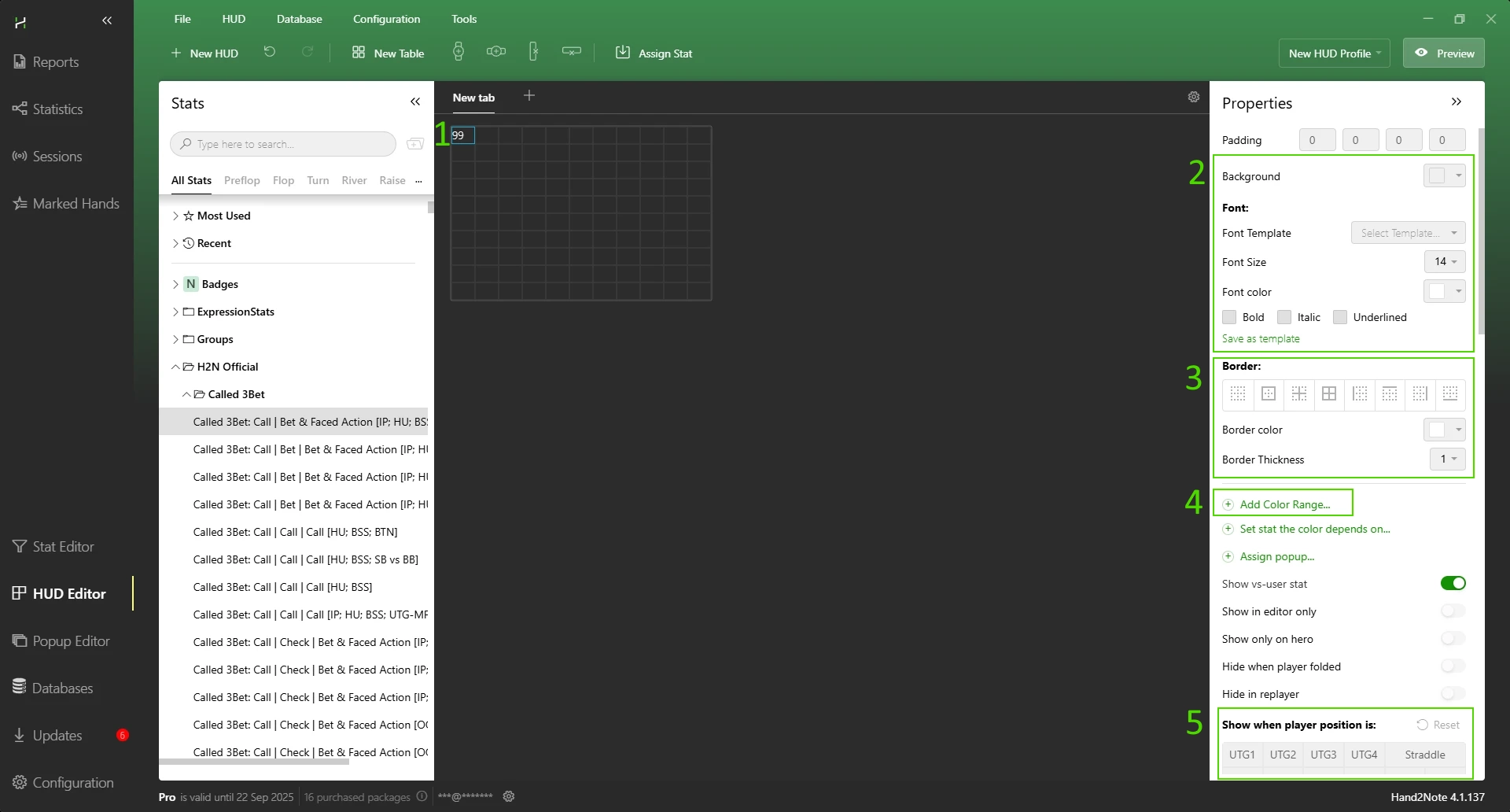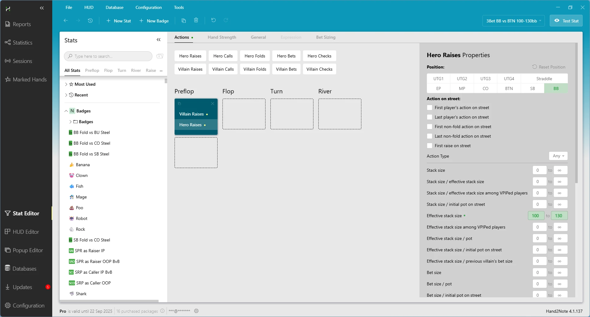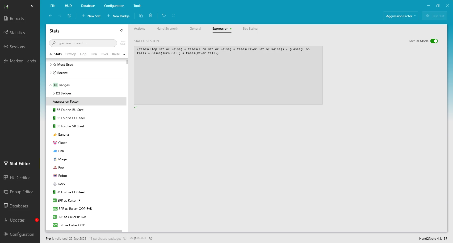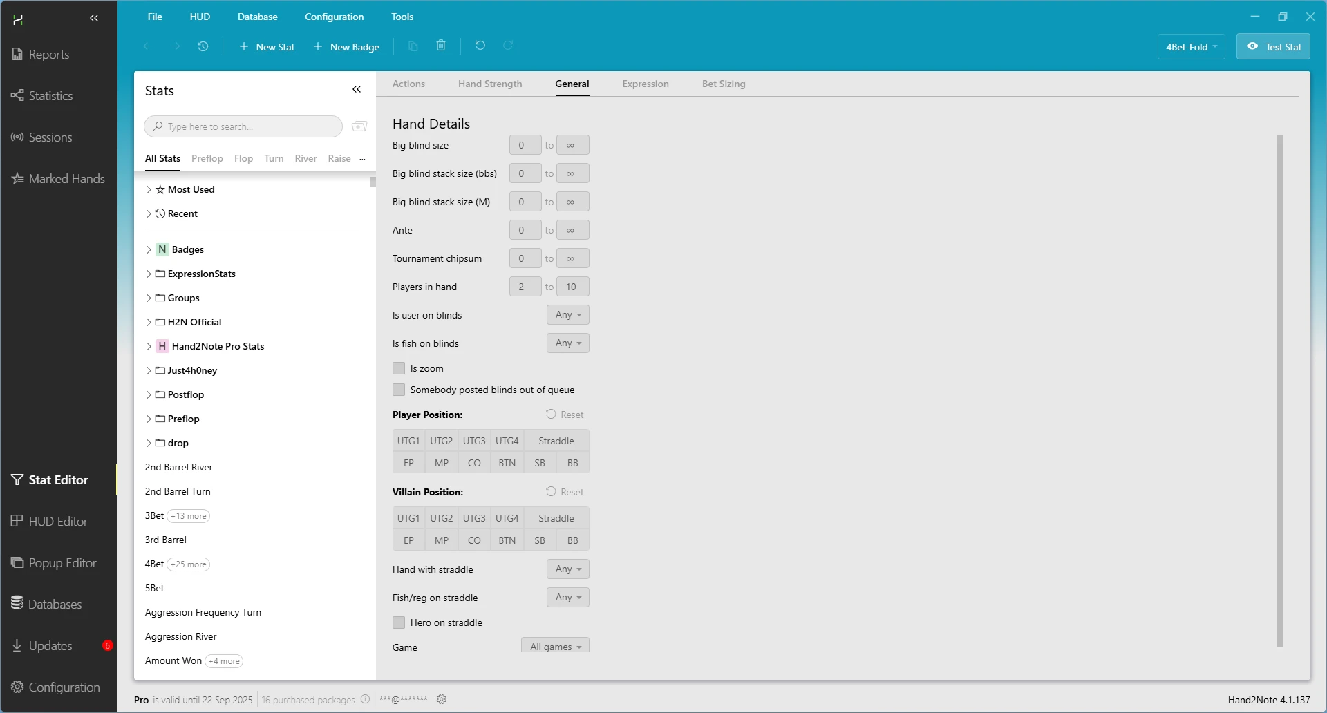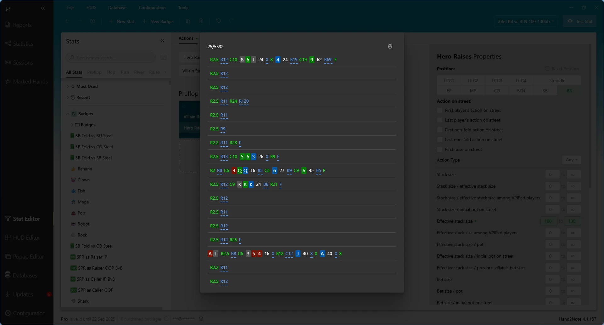19 Aug 2025 Intermediate This material is for medium-skilled players HUD MDA stats Hand2Note is a powerful tool for analyzing poker hands, offering the ability to create and customize your own stats for a deeper understanding of the game. In this lesson, we will examine the process of creating simple and advanced stats in Hand2Note 4, as well as their integration into HUDs and pop‑ups, with detailed examples and illustrations. Introduction to Hand2Note Stats In Hand2Note, stats are divided into two main categories: Simple stats - show the frequency of a specific action in a particular game situation, such as Open Raise or Continuation Bet. Advanced stats - calculated by specific formulas using simple stats as arguments, for example, Aggression Factor or WTSD. Example of a simple stat: Open Raise - shows how often a player makes the first raise preflop. Example of an advanced stat: Aggression Factor is calculated by the formula: (Cases(Flop Bet or Raise) + Cases(Turn Bet or Raise) + Cases(River Bet or Raise)) / (Cases(Flop Call) + Cases(Turn Call) + Cases(River Call)) ⚠️ In the stats editor, "Hero" always refers to the player for whom the stat is being gathered. For example, if you want to see how an opponent opens from EP, in the stats editor under Hero specify position EP. "Villain" usually refers to all the players remaining in the hand. To narrow a particular statistic, specify the Villain's position or a custom ID you assigned preflop. Overview of Stats Editor Tabs Actions Tab The Actions tab lets you define the sequence of moves for Hero and Villain on selected streets. In the central window, click action buttons (Bet, Raise, Call, Check, Fold) for Hero and Villain. Use the selector to choose which street (Preflop, Flop, Turn, River) these conditions apply to. When you select a street or specific action, a properties panel appears on the right: Initial pot - the size of the pot at the moment of action Initial players count - number of players in the hand on that street Initial stack size - stack sizes of the players For each action, you can also set additional parameters such as preflop position, stack range, pot percentage, and more. Hand Strength Tab On the Hand Strength tab, you can filter by Hero's hand strength and board texture: In the Hand Value section, choose pocket‑hand categories (pairs, draws, "Air," etc.). In the Board section, describe the required board structure (presence of flush/straight draws, specific card ranks, etc.). All conditions show up in the central field, where you can combine them with logical operators And, Or, Not; you can break a group by selecting it and clicking Ungroup. General Tab In General, set the basic hand parameters: Game format (cash or tournament) and poker discipline (Hold'em, Omaha, etc.) Blind and ante sizes Hero and Villain positions Additional options: Players in hand, Fish on blinds Stardle, etc.. Creating Simple Stats Preflop Step 1: Open the Stats Editor Go to Stats Editor. Click Create New Stat and enter a name, for example: 3Bet BB vs BTN 100‑130bb This stat will show how often opponents on the BB 3‑bet a preflop open from BTN in heads‑up with effective stacks of 100-130 BB. Step 2: Configure Action Conditions In the Actions section add these conditions: Villain: Raise from BTN, first non‑fold action Hero: Raise from BB, effective stack 100-130 BB First player's action on street - only count situations where the specified action was the first action the player took that street. Last player's action on street - only count situations where the specified action was the last action the player took that street. First non‑fold action on street - no other actions (aside from folds) occurred before the specified action that street. Last non‑fold action on street - no other actions (aside from folds) occurred after the specified action that street. First raise on street - mostly used preflop to exclude isolations. Step 3: Test the Stat Click Test at the top of the editor. Review the hands matching the conditions to ensure the stat is correct. Postflop Step 1: Open the Stats Editor (if you closed it by accident) Go to Stats Editor. Click Create New Stat and enter: BB call vs BTN | X | Bet | CBet This stat will show how often opponents on BB call preflop and then fire two barrels against a missed flop C‑bet from BTN. Step 2: Configure Action Conditions In Actions add: Preflop: Villain: Raise from BTN (first non‑fold); Hero: Call from BB. Flop: Hero: Check (last action). Turn: Hero: Bet (last action). River: Hero: Bet. Step 3: Test the Stat Click Test and verify the resulting hands. Creating Advanced Stats Step 1: Open the Stats Editor Go to Stats Editor. Click Create New Stat and enter a name, e.g. Aggression Factor. Then switch to the Expressions tab. Step 2: Enter the Formula Use simple stats as arguments in formula: (Cases(Flop Bet or Raise) + Cases(Turn Bet or Raise) + Cases(River Bet or Raise)) / (Cases(Flop Call) + Cases(Turn Call) + Cases(River Call)) Available formula functions: Value - returns the percentage value of the chosen stat. Cases - shows the number of hands where the player's actions met the specified condition. Opps - indicates how many hands the player had the opportunity to perform the action. VsHeroCases - counts how many hands the player acted against Hero and met the filter. VsHeroOpps - shows how many hands the player faced Hero and had the chance to meet the filter. WonHandCases - returns the number of hands where the player's action met the filter and won the pot. WentToSDCases - records how many hands met the filter and went to showdown. WonHandAtSDCases - shows how many hands met the filter, went to showdown, and won the hand. AmountWon - sums the player's winnings in big blinds for all hands meeting the filter. Adding a Stat to HUD or Pop‑up Step 1: Open the HUD or Pop‑up Editor Select an existing profile or create a new one. Step 2: Add the Stat Option 1: Select a cell → Right