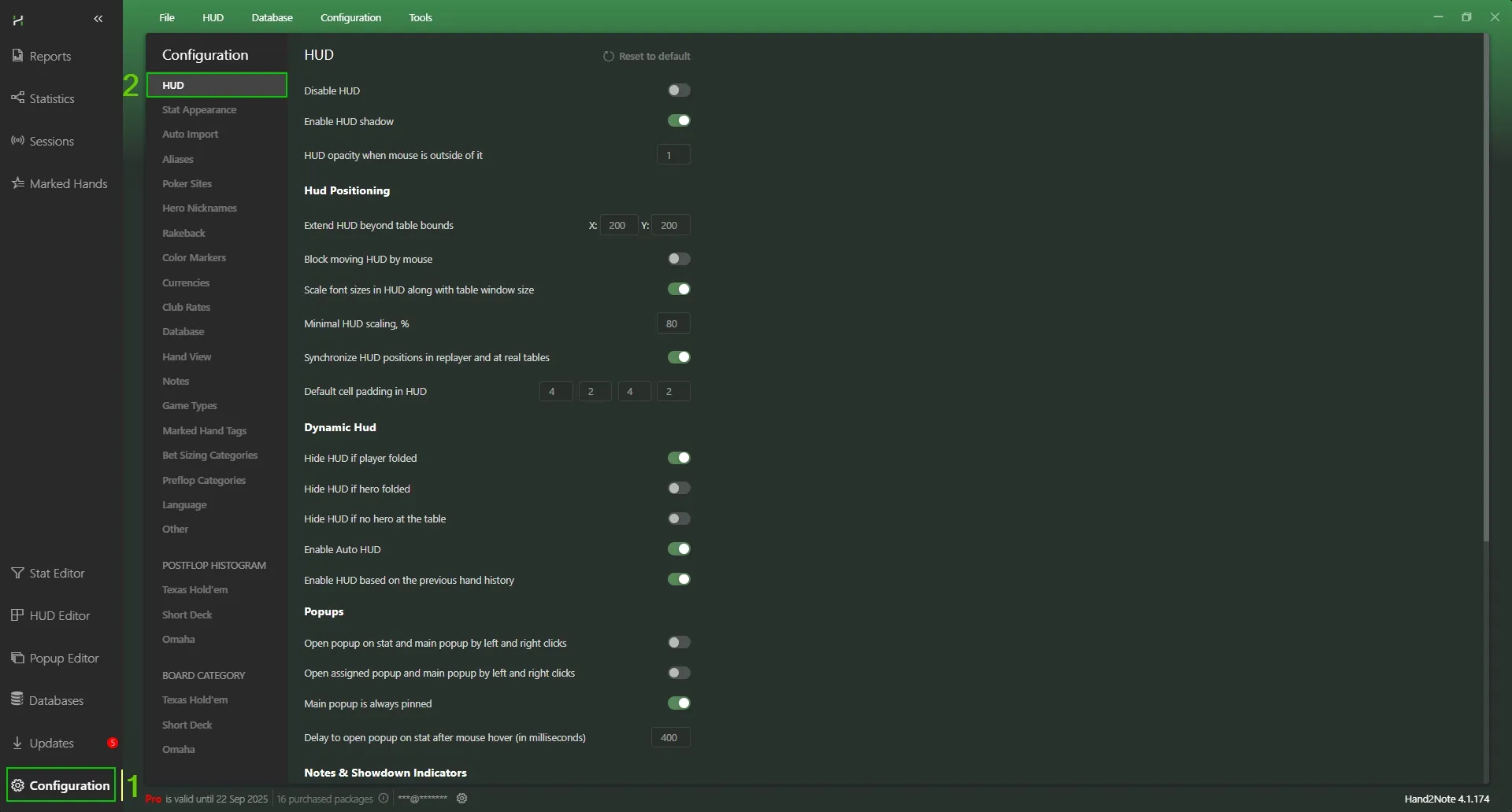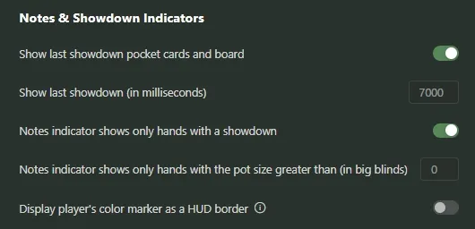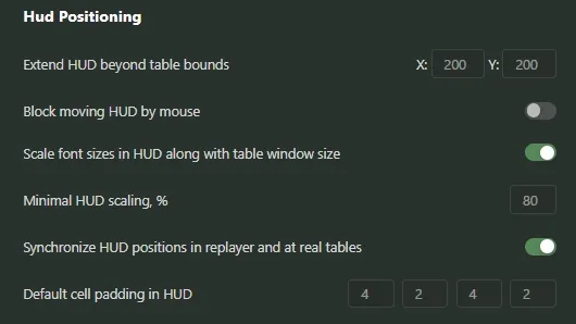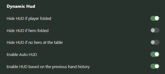 21 Sep 2025 Intermediate This material is for medium-skilled players HUD stats HUD (Heads-Up Display) in Hand2Note 4.1 displays real-time statistics on opponents right at the table, helping to quickly assess their playing style. The correct HUD setting is crucial for effective analysis of draws: by selecting the necessary data and hiding the excess, the player frees up space on the screen and focuses on important information. Thanks to the flexible options in the Settings section, you can control when the HUD is displayed or updated, and exactly what the statistics look like. Below we will take a detailed look at all the available options in this section and their purpose. The HUD settings tab is divided into 6 subsections and below we will go through each of them: HUD Disable HUD - completely disables the display of all HUD windows on tables (both in real time and in the replay). It is useful, for example, if you do not want to see the HUD in a certain situation, but at the same time continue to collect statistics. Enable HUD shadow - enables or disables the shadow under HUD windows. The shadow can make it easier to see the HUD on a bright or multicolored background of tables. If the background of the table is dark and the HUD panel is clearly visible, you can turn it off for a cleaner look. HUD opacity when mouse is outside of it - sets the transparency of the HUD when the mouse cursor is outside its boundaries. At a value of 1, the HUD is always fully visible; at lower values, the HUD becomes translucent until you hover the mouse over it. This is convenient so that the HUD does not interfere with the view of the table during periods of idleness, but immediately appears when pointing. HUD Positioning Extend HUD beyond table bounds (X, Y) - sets the maximum possible indentation of HUD windows outside the tables horizontally (X) and vertically (Y). The higher the value, the further you can move the HUD beyond the boundaries of the table window. For example, by installing 800×800, you can freely position the HUD panels outside the game table, which allows you not to clutter the table itself. Block moving HUD by mouse - prohibits moving the HUD panels with the mouse during the game. When this option is enabled, you will not be able to accidentally "shift" the HUD. Scale font sizes in HUD along with table window size - scales fonts in HUD when changing the size of the table window. If enabled, all HUD labels will automatically scale when you zoom in or out of the table windows. This is convenient when playing on different resolutions or window sizes, so that the HUD always remains readable. Minimal HUD scaling, % - the minimum percentage of HUD scaling when resizing tables. For example, 80% means that when the window is reduced to a minimum, the HUD font will not become smaller than 80% of the original size. It helps to avoid too small and unreadable numbers in the HUD when the window is greatly reduced. Synchronize HUD positions in the replay and at real tables - synchronizes the location of HUD panels in the replay and in real time. If enabled, when viewing the hand history (replays), the HUD panels will be positioned exactly the same as on the table. This is convenient so as not to get confused about the location of statistics between different viewing modes. Default cell padding in HUD - sets the internal padding between the statistics elements inside each HUD cell. Sets the distance (with margins on the left, top, right, and bottom) from the frame of the HUD panel to the text in it. It allows you to control the density of data display: a larger indentation makes the HUD more "airy", a smaller one makes it more compact. Dynamic HUD Hide HUD if player folded - hides the HUD for the player immediately after he discards the cards. It is useful not to be distracted by the statistics of players who have already passed. After the next hand, the HUD for that player will return. Hide HUD if Hero folded - hides all HUD panels on the table immediately after the "Hero" discards the cards. This means that immediately after your fold, the HUD will not be displayed until the start of a new hand. Allows you to focus on the process of dealing when another player moves. Hide HUD if there is no Hero at the table - The HUD will be shown only if there is a “Hero" at the table. If you are not at the table, HUD statistics are not displayed. This setting is useful if you are participating in several games at the same time and want to see the HUD only on those tables where you are playing. Enable Auto HUD - enables and disables Auto HUD mode. Enable HUD based on the previous hand history - The function provides the output of HUD windows based on the distribution history, automatically imported into the system. It can be useful in cases where the standard HUD window display method does not work correctly or causes critical errors. Popups Open popup on stat and main popup by left and right clicks - switches the way statistics popups open. If enabled, a pop-up block for specific statistics opens by clicking the left or right mouse button instead of hovering the cursor. This way you don't have to hold the cursor over the number for a long time - just click. If this option is disabled, the popup is called at mouse hover with a delay. Open assigned popup and main popup by left and right clicks - similar to the previous option, but for "linked" popups. When you turn on the left or right mouse button, the pop-up that you have assigned to these statistics opens. This setting is convenient for those who prefer clicking instead of pointing to open additional information windows. Main popup is always pinned - pins (fixes) the main popup window of the HUD. If this option is enabled, the main statistics window remains on the screen until you close it yourself. Otherwise, it may automatically hide when you click outside its area. Pinning is useful so that you don't accidentally close the pop. Delay to open popup on stat a