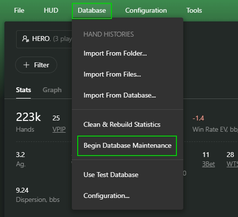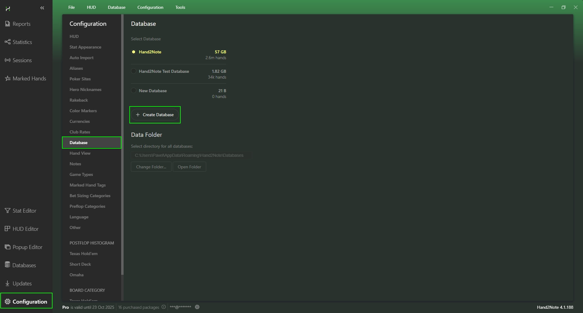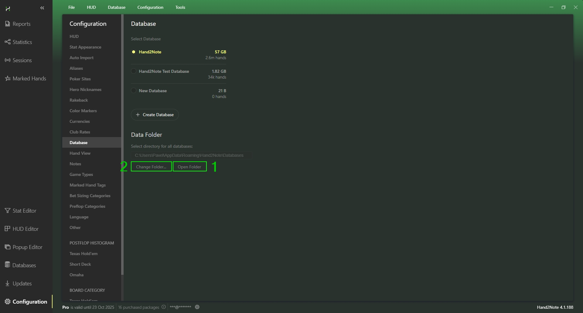 23 Oct 2025 Intermediate This material is for medium-skilled players HUD Today we will look at how Hand2Note 4.1 works with databases - and why delve into this topic at all. The database is the foundation of all your analytics. It stores the played hands, opponent statistics, and analysis results. Without it, Hand2Note will not be able to show the HUD or build a report. Dividing the databases helps to put things in order: you can create a separate database for each limit, poker room, student, or game format. This makes the work faster, more convenient and safer. Let's figure out how to create, switch, transfer, delete databases and make backups - all in simple steps and with examples. Creating and switching databases Database management is located in the Settings of Hand2Note → Database. To create a new database, follow these steps: Open Hand2Note and go to Settings → Database. Click the "Create database..." button. Enter a convenient name for the new database. Click "Ok". Hand2Note will create a new database and make it the main one. Thus, you have created an absolutely clean database. Please note that after creating a new database, old distributions are not transferred automatically - they can be imported if necessary (see the sections below). To switch between existing databases, also use the Settings menu. A list of available databases will appear in it. Select the desired one and just click on it, Hand2Note activates the selected database. After selecting the database, the HUD and reports will then work with the selected database. The next time you start Hand2Note, it usually opens the last activated database. Changing the path and transferring the database Sometimes it is necessary to move the database to another disk (for example, from HDD to SSD) or save it on external media. This is done through the same settings. Procedure of actions: Open Settings → Database. Click "Open Folder" (1) to open the current folder with the database files (by default %AppData%\Roaming\Hand2Note\DataBases). Copy all the files from this folder to the desired new location on the disk (for example, on an SSD or another local drive). Go back to Settings → Database and click "Edit Folder" (2). Specify the path to the folder where you copied the files. When transferring the database, it is important to keep the complete folder structure - do not change the names of files and folders inside the database. The new storage should have enough free space: Hand2Note databases can take up tens of gigabytes with a large volume of distributions. It is not recommended to place the database on network or cloud drives, as an unstable connection can lead to data corruption. It is preferable to use a local SSD, and besides, Hand2Note is sensitive to incorrect paths: Cyrillic letters cannot be used in the names of startup and database folders. Deleting and backing up If the database is no longer needed, you can delete it directly from Hand2Note. Open Settings → Database, when you hover your mouse over an inactive database, the trash icon will appear, clicking on which you will delete the database. This will delete all database files (by default in %AppData%\Roaming\Hand2Note\DataBases\...). Attention: before deleting, make sure that you really want to get rid of the data - it is impossible to restore distributions from the database after deletion. If you do not plan to use the database further, I recommend making a copy of it first and then deleting it. To back up the database, simply copy the folder with the database files to a secure location, on an external disk, network resource, or cloud. This is the most reliable method: in case of a PC failure or Windows reinstallation, you can restore the database by copying it back. Optimization and technical advice Large and overloaded databases can slow down Hand2Note. To avoid lags, follow these recommendations: Create a separate database for cash games, and a second database for tournaments. Then Hand2Note will build stats faster, and the HUD will load without unnecessary load. Perform maintenance periodically. Hand2Note has a maintenance - Database -> Begin Database maintenance tool. It removes unused or corrupted stats from the configuration. Be sure to keep the databases on a fast SSD drive. The access and read/write time on an SSD is significantly higher than on an HDD, especially with a large number of files. Transferring the database to an SSD often gives a noticeable increase in the speed of loading HUDs and reports. If you are coaching players, use multiple databases for each individual student. This makes it easier to work with individual reports and you won't worry about "mixing" the distributions of different sessions. Conclusion Proper organization and maintenance of Hand2Note 4.1 databases significantly increase the efficiency of game analysis and reduce the load on Hand2Note and speed up its work. Regular backups and database maintenance will keep your distributions safe and sound. You can buy Hand2Note subscription with 10% discount using our promo code: GETCOACH Buy Subscription With 10% Discount