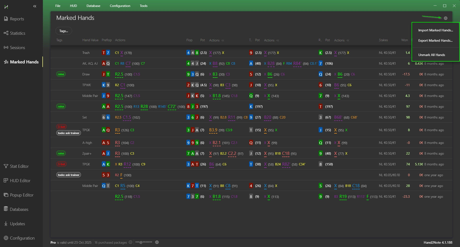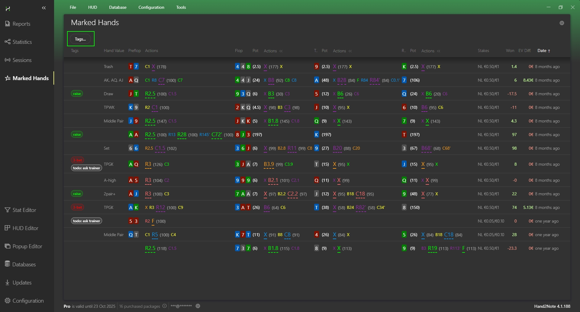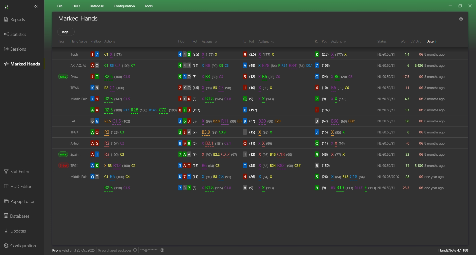 17 Oct 2025 Intermediate This material is for medium-skilled players EV HUD MDA Marking hands is one of the key learning tools. By allowing players to identify interesting or problematic hands, they can then easily find them in the database, analyze them, and adjust their strategy. Hand2Note provides a flexible system of color tags to mark any situation - mistakes, bluffs, difficult folds, etc. and structure them for learning. Why do you need to mark hands? Regular marking of hands makes the learning process more structured. Firstly, it helps to filter important situations: for example, you can mark all the big losing pots or bluff hands of your opponent. Secondly, it allows you to "unload" interesting hands for review after the session or together with the coach. Marking such hands in real time or immediately after the game saves time on searching. Finally, the tagged hands can be exported and shared with trainers or a training group. How to mark hands in Hand2Note 4.1 Setting up tags Immediately after installation, Hand2Note already has several standard handout tags. You can create your own tags of any color and name. To do this, open the "Configuration" and select the "Marked Hand Tags" tab. In it, click "Create Tag..." - a new label "My Tag" will appear, which can be renamed and colored. When you hover over a placemark, icons appear to change its position in the list, name it, and delete it. Thus, you can prepare tags in advance for different purposes (for example, "Bluff", "fold on the river?", "3-bet pot", etc.) and assign them to the hands during the game or later. This gives flexibility in the organization of your game: you can assign several tags to one hand at once or mark it without a tag at all if you just need a quick "checkbox" for your hand. Marking hands during the game Hand2Note 4.1 supports keyboard shortcuts to instantly mark the last hand played. This allows you to mark hands right at the table without being distracted by additional clicks. By default, this is: F5 - mark the last hand without using a tag.; F6 - mark the last hand with the assigned tag (the tag is usually set immediately before clicking, see below). These keys can be reconfigured. To do this, in the same Configuration window, go to the "HUD" tab, find the "Hot Keys" column and change the "Mark last hand key" and "Mark last hand with tags key" parameters to any convenient combinations. Marking hands out of tables If you are analyzing the played session, you can mark the necessary hand after the end. In the main window of Hand2Note, select the "Reports" or "Sessions" menu and find the desired hand in the "Hands" list. Right-click on it and select: "Mark Hand" - mark without tag; "Mark Hand With Tags..." - mark with the tag selection. After that, they will automatically be placed in the "Marked Hands" section of the main window. Viewing and filtering marked hands All marked hands are collected in a separate Hand2Note - Marked Hands section. Open the Marked Hands program in the main window. Here you will see a table with all marked hands: the assigned labels (colored squares) or their absence are displayed in the left column. For convenience, you can filter this list by tags. Click the "Tags..." button, and select the appropriate tags in the menu that appears: then Hand2Note will show only those distributions that are marked with these tags. For example, you can display only the hands labeled "3Bet" or remove all unnecessary categories from the list. In addition to filtering, you can sort and import/export handouts in the Marked Hands section. The gear icon on the top right provides the following functions: Import Marked Hands... - import hands into the current database; Export Marked Hands... - save selected hands to files; Unmark All Hands - remove marks from all hands at once. Exporting is especially useful for joint analysis: you can unload the marked hands and send them to the trainer for analysis. Marked hands are used for various training purposes: Independent analysis. After the session, the marked hands serve as a "what to sort" list. The player scrolls through the list in Hand2Note or uploads the hands to the poker simulator. By focusing on pre-marked hands, he won't miss the key points. Group analysis or working with a coach. You can export a collection of marked hands and give it to a trainer or debriefing partners. Instead of a cumbersome list of unstructured hands, the trainer will receive a "self-list" of problematic examples. Hypothesis testing. By marking the hands according to criteria (for example, all 3-bet pots in which the opponent has continued), you create a sample to "study" the opponent's aggression level. Then you analyze trends: for example, how many times you forced your opponent to pass on the river, or how often your flop call wins with our range. Conclusion Marking hands in Hand2Note 4.1 is a powerful way to structure the training process. By marking the key hands (any difficult situations, mistakes, or interesting hands), the player receives a personal database for further analysis. Using tags and hotkeys, Hand2Note makes the marking process fast, filtering and exporting marked hands convenient for further analysis. When using this feature correctly, the gameplay becomes part of the learning cycle: you notice your hands on the go, and in the evening you sort them out in a calm environment and adjust your strategy. This systematic approach allows you to find and eliminate licks in the game faster, making the process of learning poker more conscious and effective.