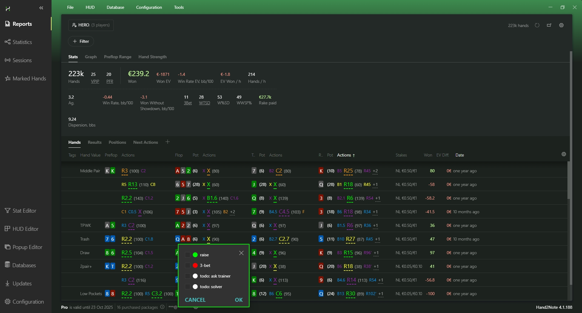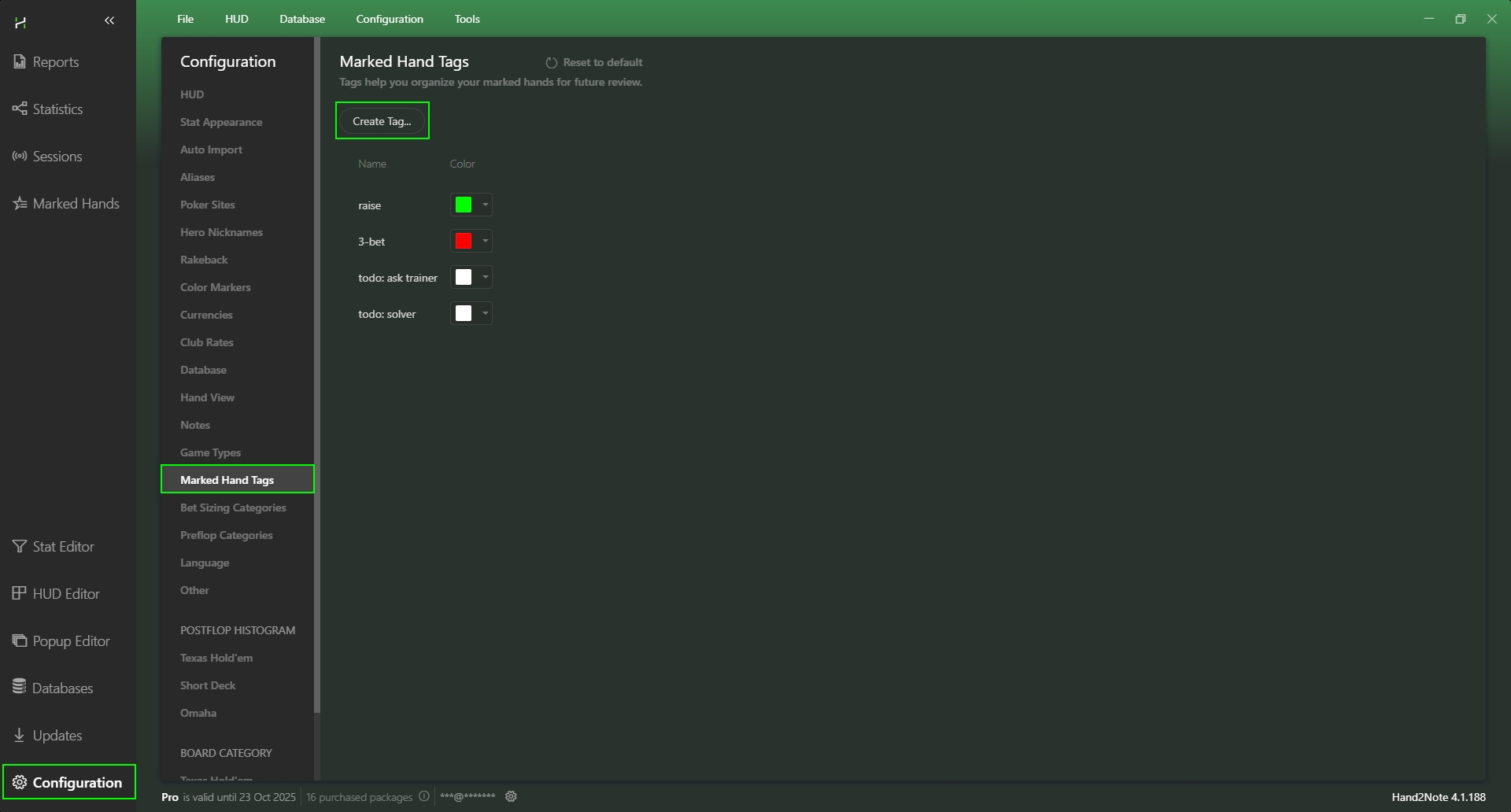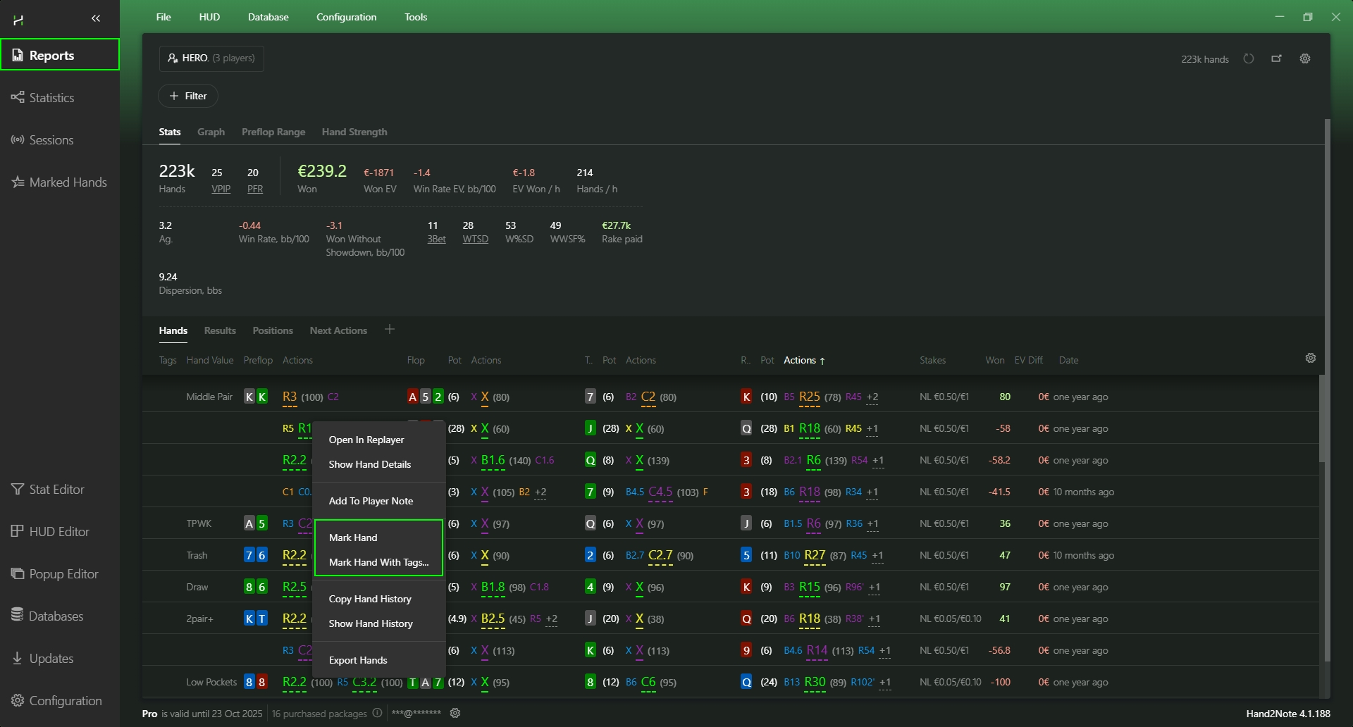 17 Oct 2025 Intermediate This material is for medium-skilled players EV HUD MDA Marking hands is one of the key learning tools. By allowing players to identify interesting or problematic hands, they can then easily find them in the database, analyze them, and adjust their strategy. Hand2Note provides a flexible system of color tags to mark any situation - mistakes, bluffs, difficult folds, etc. and structure them for learning. Why do you need to mark hands? Regular marking of hands makes the learning process more structured. Firstly, it helps to filter important situations: for example, you can mark all the big losing pots or bluff hands of your opponent. Secondly, it allows you to "unload" interesting hands for review after the session or together with the coach. Marking such hands in real time or immediately after the game saves time on searching. Finally, the tagged hands can be exported and shared with trainers or a training group. How to mark hands in Hand2Note 4.1 Setting up tags Immediately after installation, Hand2Note already has several standard handout tags. You can create your own tags of any color and name. To do this, open the "Configuration" and select the "Marked Hand Tags" tab. In it, click "Create Tag..." - a new label "My Tag" will appear, which can be renamed and colored. When you hover over a placemark, icons appear to change its position in the list, name it, and delete it. Thus, you can prepare tags in advance for different purposes (for example, "Bluff", "fold on the river?", "3-bet pot", etc.) and assign them to the hands during the game or later. This gives flexibility in the organization of your game: you can assign several tags to one hand at once or mark it without a tag at all if you just need a quick "checkbox" for your hand. Marking hands during the game Hand2Note 4.1 supports keyboard shortcuts to instantly mark the last hand played. This allows you to mark hands right at the table without being distracted by additional clicks. By default, this is: F5 - mark the last hand without using a tag.; F6 - mark the last hand with the assigned tag (the tag is usually set immediately before clicking, see below). These keys can be reconfigured. To do this, in the same Configuration window, go to the "HUD" tab, find the "Hot Keys" column and change the "Mark last hand key" and "Mark last hand with tags key" parameters to any convenient combinations. Marking hands out of tables If you are analyzing the played session, you can mark the necessary hand after the end. In the main window of Hand2Note, select the "Reports" or "Sessions" menu and find the desired hand in the "Hands" list. Right-click on it and select: "Mark Hand" - mark without tag; "Mark Hand With Tags..." - mark with the tag selection. After that, they will automatically be placed in the "Marked Hands" section of the main window. Viewing and filtering marked hands All marked hands are collected in a separate Hand2Note - Marked Hands section. Open the Marked Hands program in the main window. Here you will see a table with all marked hands: the assigned labels (colored squares) or their absence are displayed in the left column. For convenience, you can filter this list by tags. Click the "Tags..." button, and select the appropriate tags in the menu that appears: then Hand2Note will show only those distributions that are marked with these tags. For example, you can display only the hands labeled "3Bet" or remove all unnecessary categories from the list. In addition to filtering, you can sort and import/export handouts in the Marked Hands section. The gear icon on the top right provides the following functions: Import Marked Hands... - import hands into the current database; Export Marked Hands... - save selected hands to files; Unmark All Hands - remove marks from all hands at once. Exporting is especially useful for joint analysis: you can unload the marked hands and send them to the trainer for analysis. Marked hands are used for various training purposes: Independent analysis. After the session, the marked hands serve as a "what to sort" list. The player scrolls through the list in Hand2Note or uploads the hands to the poker simulator. By focusing on pre-marked hands, he won't miss the key points. Group analysis or working with a coach. You can export a collection of marked hands and give it to a trainer or debriefing partners. Instead of a cumbersome list of unstructured hands, the trainer will receive a "self-list" of problematic examples. Hypothesis testing. By marking the hands according to criteria (for example, all 3-bet pots in which the opponent has continued), you create a sample to "study" the opponent's aggression level. Then you analyze trends: for example, how many times you forced your opponent to pass on the river, or how often your flop call wins with our range. Conclusion Marking hands in Hand2Note 4.1 is a powerful way to structure the training process. By marking the key hands (any difficult situations, mistakes, or interesting hands), the player receives a personal database for further analysis. Using tags and hotkeys, Hand2Note makes the marking process fast, filtering and exporting marked hands convenient for further analysis. When using this feature correctly, the gameplay becomes part of the learning cycle: you notice your hands on the go, and in the evening you sort them out in a calm environment and adjust your strategy. This systematic approach allows you to find and eliminate licks in the game faster, making the process of learning poker more conscious and effective.
