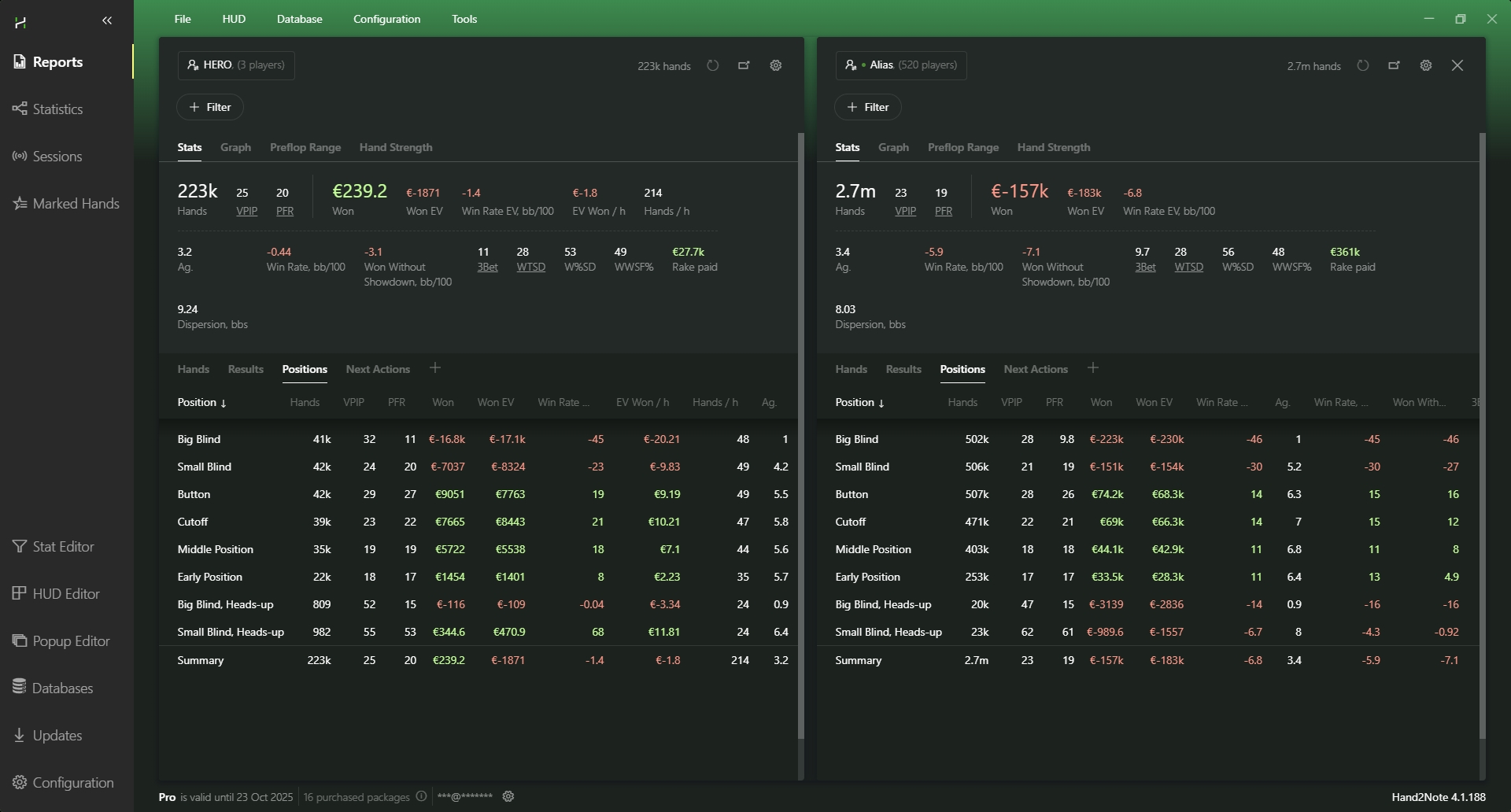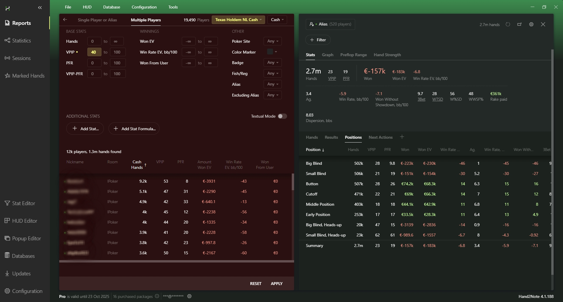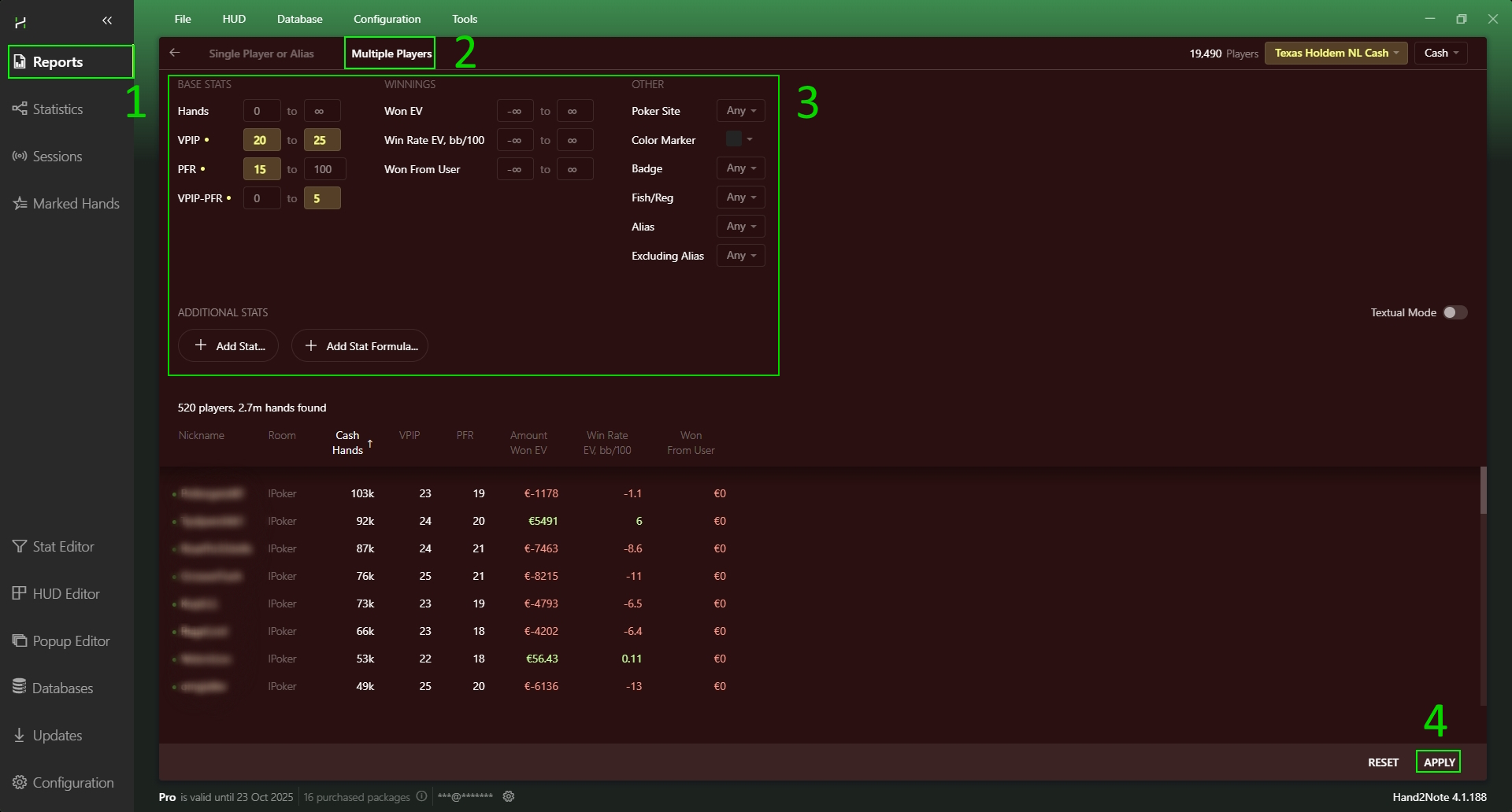 30 Oct 2025 Intermediate This material is for medium-skilled players EV GTO HUD MDA studying Analyzing the trends of the Multiple Players reports field in poker is the study of the average playing style of the entire player base or its parts. With the help of this analysis, you can identify typical leaks of the playing field and build a strategy not based on speculation, but on real data. In Hand2Note 4.1, these features are implemented through Multiple Player Reports (MPR). MPRS allow you to select a group of players based on specified criteria and aggregate their statistics into a single report. This is especially important for building an exploitative strategy: instead of blindly focusing on a theoretically "balanced" (GTO) approach, we study the average weaknesses of the field and adapt our game to them. For example, comparing your 3-bet frequency with the population average will immediately show whether you are playing tighter or more aggressively relative to the field. In this way, MPRS turn disparate opponent data into valuable strategic insights. How Multi-Player Reports (MPR) work The idea is simple: we take similar players and combine their hands as if they were "one whole". This solves the typical problem of lack of sampling: a single opponent may not have enough played hands for reliable conclusions, but there are already plenty of them for a group. In fact, MPR "filters out" not the game situations, but the players themselves: you set the conditions for the players (their VPIP, raise frequency, winnings, etc.), select a group and click "Apply". Hand2Note collects tens and hundreds of thousands of hands from these players and outputs general statistics. It's as if we see the "average" player from the selected category all at once. MPR differs from regular reports in that it does not look at one specific opponent, but at the combined data of many. Multi-Player reports solves the problem of a single player's lack of sampling: "by aggregating the statistics of similar players, you can estimate or deduce their range, gaining a more accurate understanding of the real strategy." At the same time, Hand2Note is able to process millions of hands and quickly produces results even on large samples. In other words, MPR is a powerful general data analyzer that allows you to deeply explore the ranges, bets and lines of the entire player base. Creating and configuring Multiple Player Report in Hand2Note 4.1 To create an MPR, follow these steps: Open the Reports tab in the Hand2Note main menu. Click on your nickname (or the desired player) to open the Player Dialog. Go to the Multiple Players tab. Here you will see the interface for setting up a group of players. To create a report, select a database and a date range. Then set the filters by which the players will be selected. These can be basic statistics ("Base Stats") - for example, Hands, VPIP, PFR, VPIP-PFR, etc. You can also use the "Wins" block - filters for winnings: All-in EV, Win Rate (bb/100), Won From User, and others. For in-depth analysis, there is an "Additional Stats" section where you can set your formulas based on any Hand2Note stats you have. After installing the filters, click Apply - a list of players who meet the criteria will be displayed at the bottom of the window. These will be the participants in the report. You can deselect unnecessary ones or add an alias (color label) for further grouping. When the group is ready, click Ok. Hand2Note will create a new report aggregating the statistics of the selected players. Thus, the MPR setting is the selection of a database, filters, and display conditions. You decide which players and situations to collect data on. For example, you can create an MPR for all players with 20%>VPIP>30% and PFR>15%, as shown in the example below. After the application, you will receive a report with aggregated statistics for this particular group of weak players. Grouping and filtering data When working with MPR, it is important to be able to group and filter data to refine the sample. Hand2Note 4.1 provides a flexible parameter system: By position. You can analyze players by their behavior from different positions (UTG, MP, CO, BTN, SB, BB). This helps to identify, for example, whether tight players differ from aggressive ones in early and late positions. You can enable the "Position = BTN" or other filters in the report. By stack size. An Effective Stack filter is introduced, for example, to highlight hands when the player's stack was less than 30 BB, and compare it with statistics for deep stacks. This shows whether the ranges change as the stack grows. By the type of player. Hand2Note has a system of labels (color markers) and a "Fish/Reg" classification. You can, for example, select only "regulars" or "big fish". The Color Markers interface allows you to mark a player as weak, regular, nit, koller, etc. When creating an MPR, you can filter by Fish/Reg or by a specific label. There are filters by poker rooms (PokerStars, GG, etc.) and by table limits, which is useful if you analyze multiple players from different networks. A combination of filters. Hand2Note allows you to apply multiple conditions at the same time. For example, to study the "average" regulars, you can set a VPIP of 20-30% And The PFR Is 15-25% And The EV Win Rate Is > 0. At the same time, the sample will remain focused and reliable. Using color labels, it is convenient to divide players into different types. Comparing your statistics with the field MPR can be used not only to study opponents, but also to compare your own game with the average field. To make a "Self vs Population", create two reports: one for you (the usual report), the other for all other players. Hand2Note allows you to pin reports and see them at the same time. This way you can visually compare your VPIP, PFR, blind protection frequency, 3-bet size, etc. with the population averages. Such comparisons help to adjust the strategy: either to catch up to the 